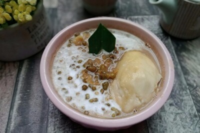 Menambahkan durian pada bubur kacang ijo menambah legit rasanya.