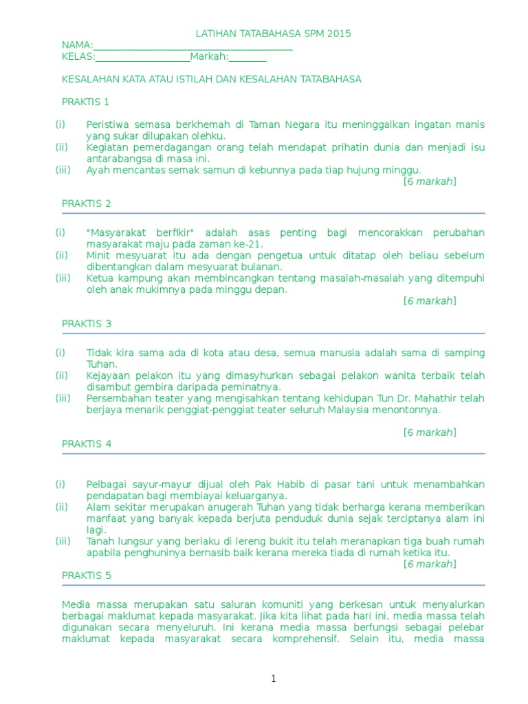 Modul Latihan Tatabahasa Spm / Soalan Tatabahasa Spm Resepi Book R - 2 dalam setiap ayat di bawah, terdapat dua kesalahan penggunaan ejaan dan imbuhan atau kesalahan penggunaan kata atau istilah atau bahasa.. Guru disiplin menahan pelajar itu selepas pehimpunan kerana melanggar peraturan sekolah. Bahasa melayu klasik kepada bahasa melayu moden (spm kssm). Latihan itu diadakan demi untuk mengeratkan hubungan antara kaum di malaysia. Tugas itu patut anda selesaikan sekarang juga. Dalam bahagian latihan ini calon akan diuji dalam bentuk prosa tradisional, ujaran atau bahasa pasar serta cakap ajuk kepada bahasa melayu baku / standard.
